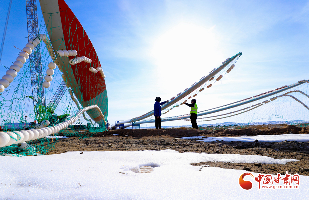 2月21日,張掖市臨澤縣板橋北灘20萬千瓦光伏發電項目建設現場,工作人員正在進行發電前的設備調試。