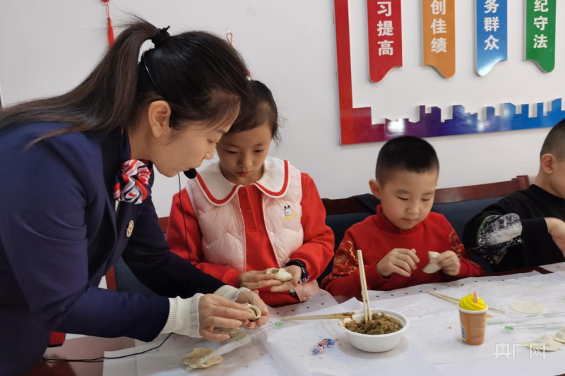 孩子們聽老師講傳統習俗體驗包餃子(央廣網發 唐欣 攝)