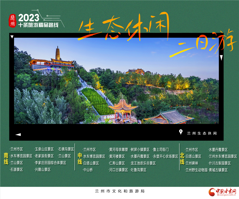 3.蘭州生態(tài)休閑2日游。這里有蘭山景區(qū),泡一壺茗茶覽金城夜景;這里有玉泉山莊,約三兩摯友慢品農(nóng)家風味;這里有李家莊田園綜合體,瓜田李下享天倫之樂;或者直接遁入興隆山,隱入深山自逍遙,當半日山居隱士。“蘭州生態(tài)休閑2日游”三條線,分別為南線、中線和北線。