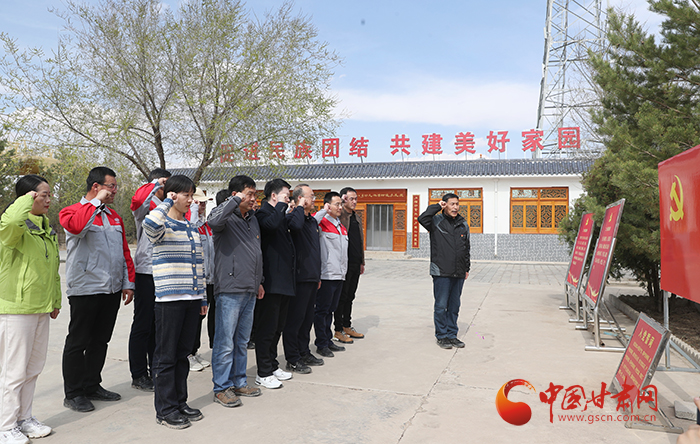 中國甘肅網和中鐵二十局市政公司黨員在八步沙紀念館莊嚴宣誓,重溫入黨誓詞。汲取“困難面前不低頭,敢把沙漠變綠洲”的八步沙精神力量。