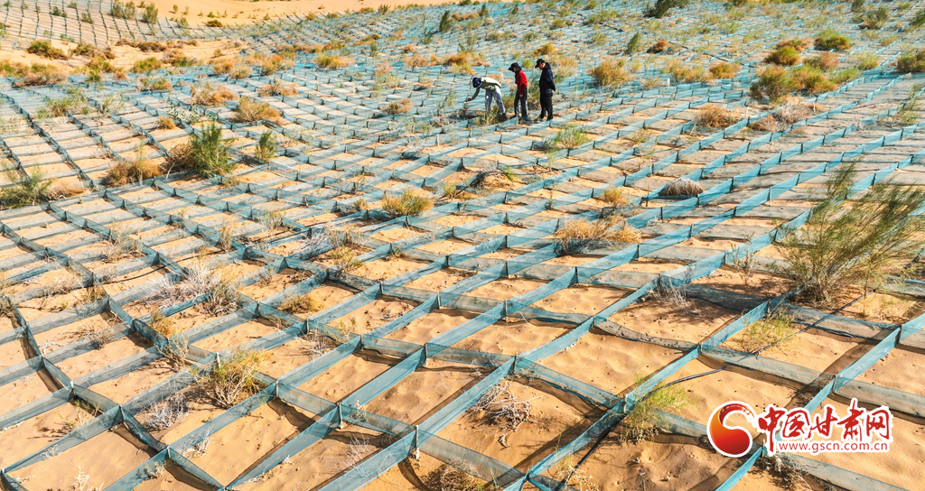 6月13日,張掖市高臺縣黑泉鎮北部荒漠區防沙治沙工程現場,林業技術人員正在壓沙方格內查看栽植梭梭的生長情況。