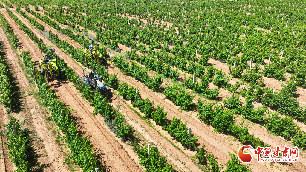 6月13日,張掖市臨澤縣板橋鎮昔日的北部荒漠區,如今已是萬畝葡萄種植基地。