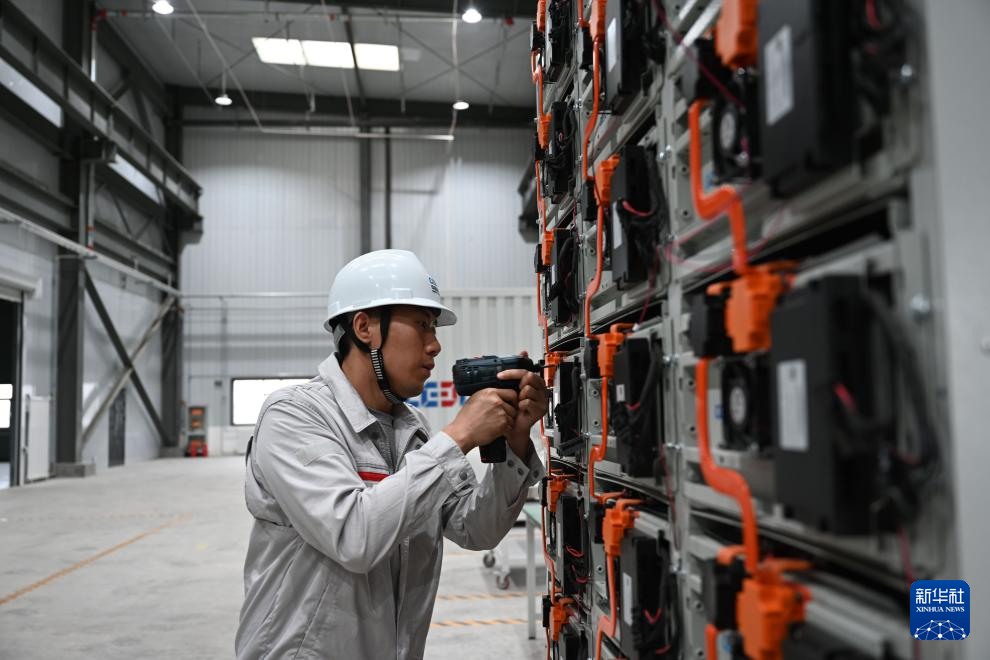 8月10日,工人在葛洲壩(甘肅)能源科技有限公司組裝電化學(xué)儲(chǔ)能裝置。新華社記者 金良快 攝