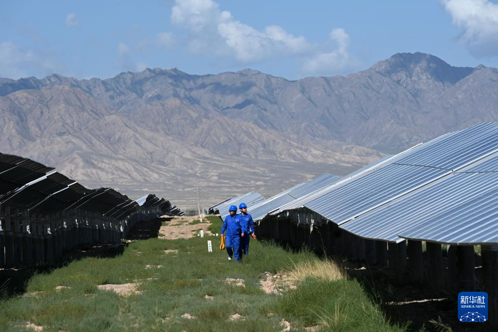 8月11日,工作人員在中國能建張掖甘州南灘30萬千瓦光伏發(fā)電項(xiàng)目巡檢。新華社記者 金良快 攝