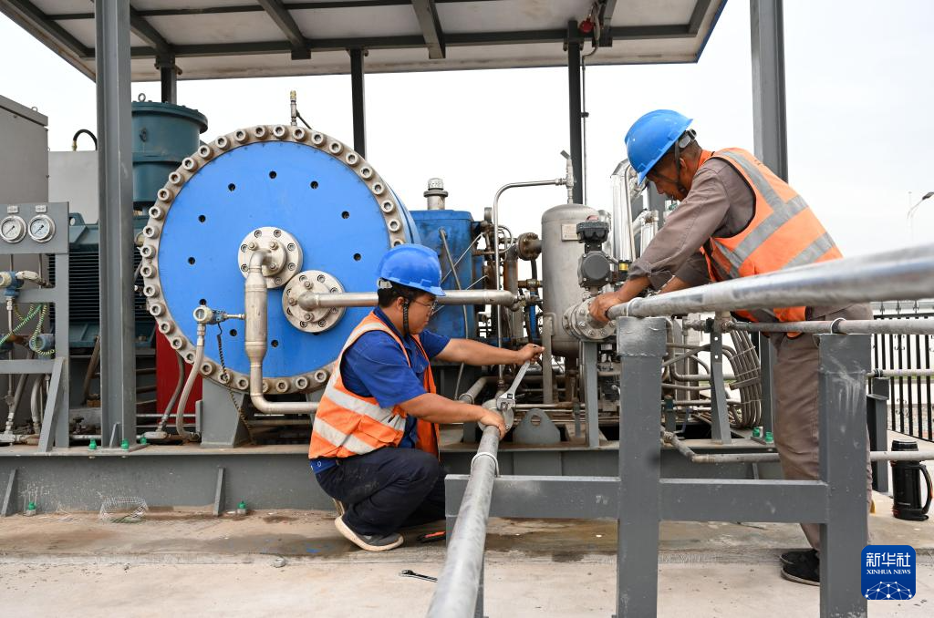 8月10日,工人在中國能建張掖氫能綜合應(yīng)用示范項(xiàng)目調(diào)試氫氣加壓裝置。新華社記者 金良快 攝