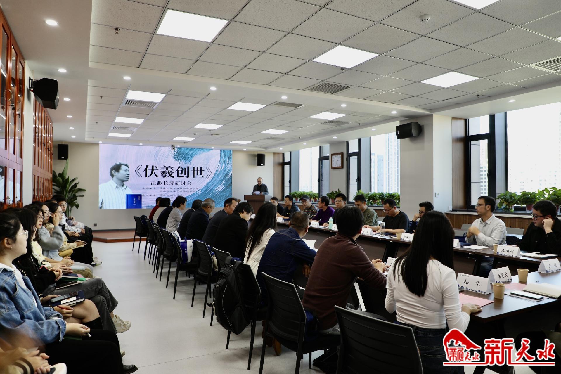 西北大學文學院副院長陳然興主持研討會。西北大學文學院副院長陳曉輝致辭。天水市文聯黨組書記、主席楊清汀,敦煌文藝出版社社長楊繼軍,詩人、評論家宋寧剛,導演、作家、詩人陳非等來自甘肅及陜西兩地的作家、評論家、導演、編輯共約30人,就汪渺作品《伏羲創世》展開深入交流,在史詩的界定、文本閱讀感受以及作品的再創造等層面進行探討。