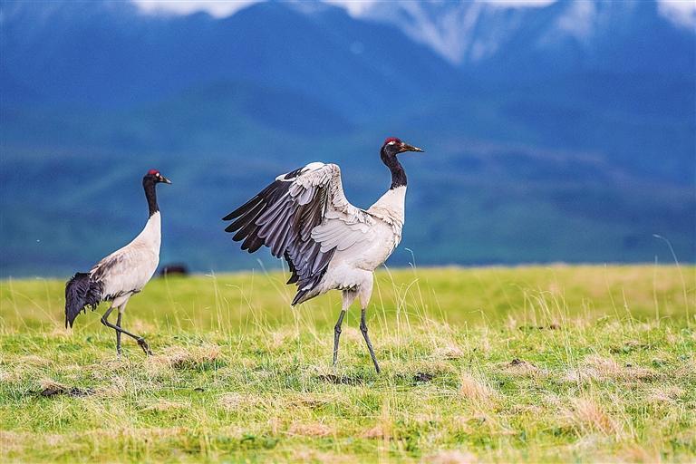 國家一級保護動物黑頸鶴在瑪曲濕地繁殖數量逐年增加。