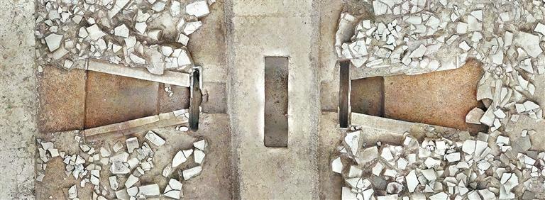 在考古發現中,我們注意到地磚磚縫采用了高超的填縫技術,形成了密封的地面,地磚鋪設有一定坡度,使得半地穴內地面由四邊到中部形成約0.1米的落差。地面上各處疊壓多件檐頭筒瓦和瓦當,由此可證明此半地穴空間上方露天,沒有屋檐,應為建筑中心天井。H1北壁有一節被破壞的陶水管接口,經解剖發現該陶水管向北穿過夯土高臺,在其北部散水處將半地穴天井中的落水排出。半地穴空間的四壁殘留上下兩排整齊排列的鐵釘,橫向釘在夯土壁上,應為固定壁磚之用,殘存壁磚邊緣可見填縫材料,經檢測填縫劑為生石灰混合少量石英砂顆粒的無機質材料,類似今天的“水泥”。