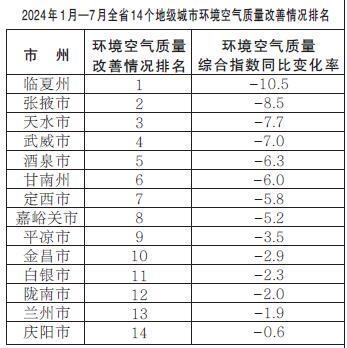 2024年1月—7月,全省14個地級城市環境空氣質量改善情況排名由好到差分別為:臨夏州、張掖市、天水市、武威市、酒泉市、甘南州、定西市、嘉峪關市、平涼市、金昌市、白銀市、隴南市、蘭州市、慶陽市。