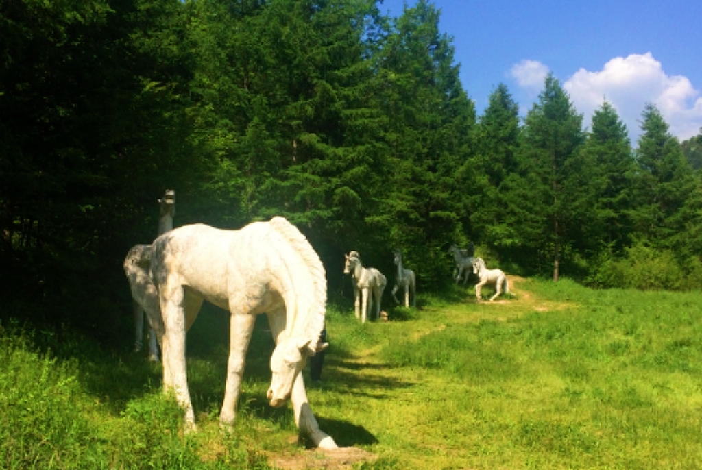 在碧草連天的谷地,當地旅游部門擺放了一組白馬的大型雕塑,栩栩如生,它們要么仰天長嘶,要么低首撫弄地上的青草,還有的彼此耳鬢廝磨,像是親密的戀人。