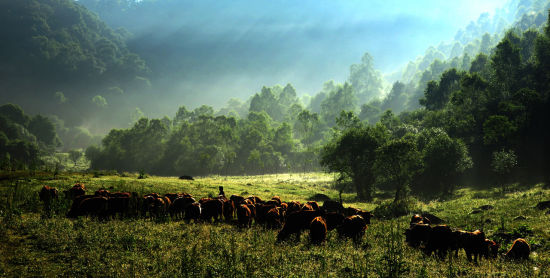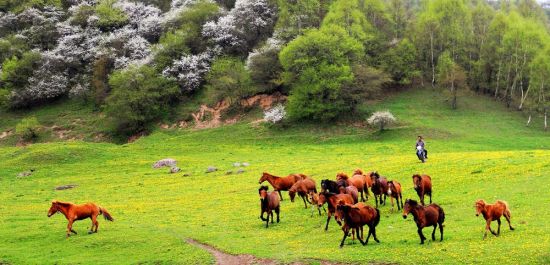 同樣是在天水市的張家川,關山,那列人文印痕飽滿的山脈像一條綠絲帶在我們面前展現著無盡的美麗,只是在張家川境內,它的旋律卻像是被擰緊的琴弦發出的,凝結,突兀,而在相鄰的陜西省隴縣,它才盡情地展示著牧場的魅力,每一處峰巒山頂上還是一片林子,到了山腰卻變成了美麗的草甸,遍布牛馬。