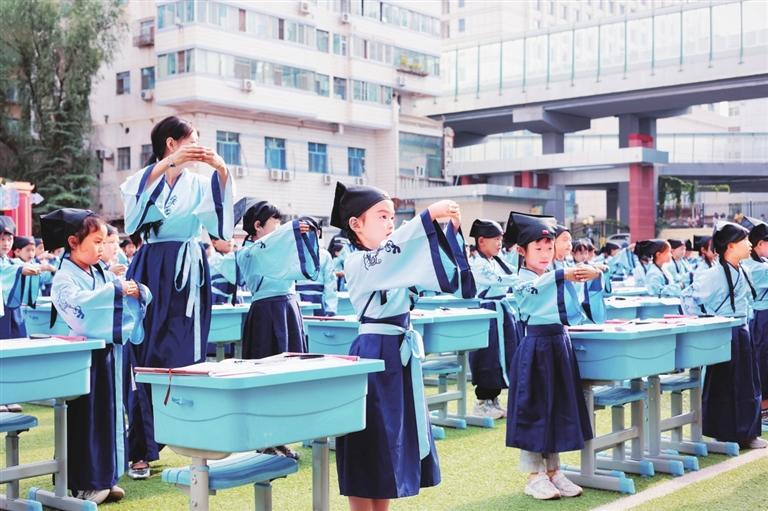 中國甘肅網9月2日訊 據蘭州晨報報道(奔流新聞·蘭州晨報記者裴強) 8月30日,蘭州市七里河教育集團為七里河小學和中車分校的600名一年級新生舉行入學“開筆禮”儀式。開筆禮在中國傳統文化中是對少兒識字習禮的稱謂,是標志少兒進入學習階段的重要紀念,是中國古代人生的首次大禮,孩子將要入學讀書寫字、習禮之時的一個傳統禮節。兩所學校600名一年級新生“端正衣冠”“感恩先賢”“朱砂啟智”“擊鼓鳴志”“啟蒙描紅”,體驗傳統“開筆禮”儀式。