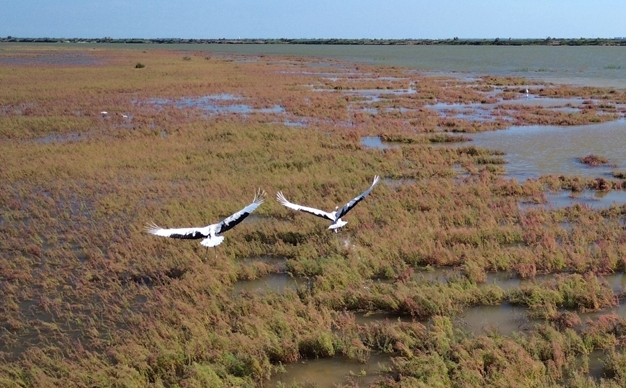 我們這里是中國東方白鸛之鄉、黑嘴鷗繁殖地,去年以來還新發現了火烈鳥、白鵜鶘、勺嘴鷸。”當地負責同志介紹,這些年通過退耕還濕、退養還灘,推進濕地修復,生態環境越來越好。