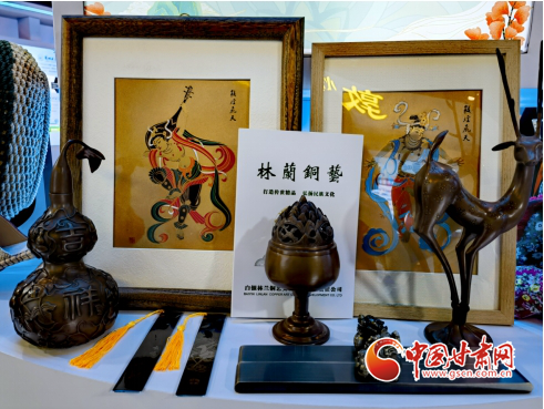 在甘肅館內的林蘭銅藝展區,白銀林蘭銅藝文化發展有限公司負責人馬艷萍一邊向觀展賓客介紹自己的產品,一邊向大家推介自己的家鄉—甘肅省白銀市。