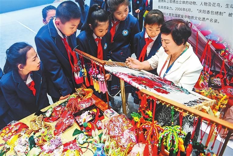 9月22日,慶陽香包刺繡展位非遺傳承人給孩子們展示刺繡技藝。新甘肅·甘肅日報(bào)記者丁凱