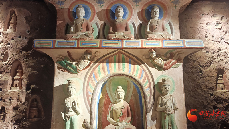 其中千佛洞第6號窟出現(xiàn)了一組巨大的一佛二弟子石雕立像,這三尊雕像保存得非常完整,連鑿刻痕跡都宛然如新,而且沒有一點缺損。