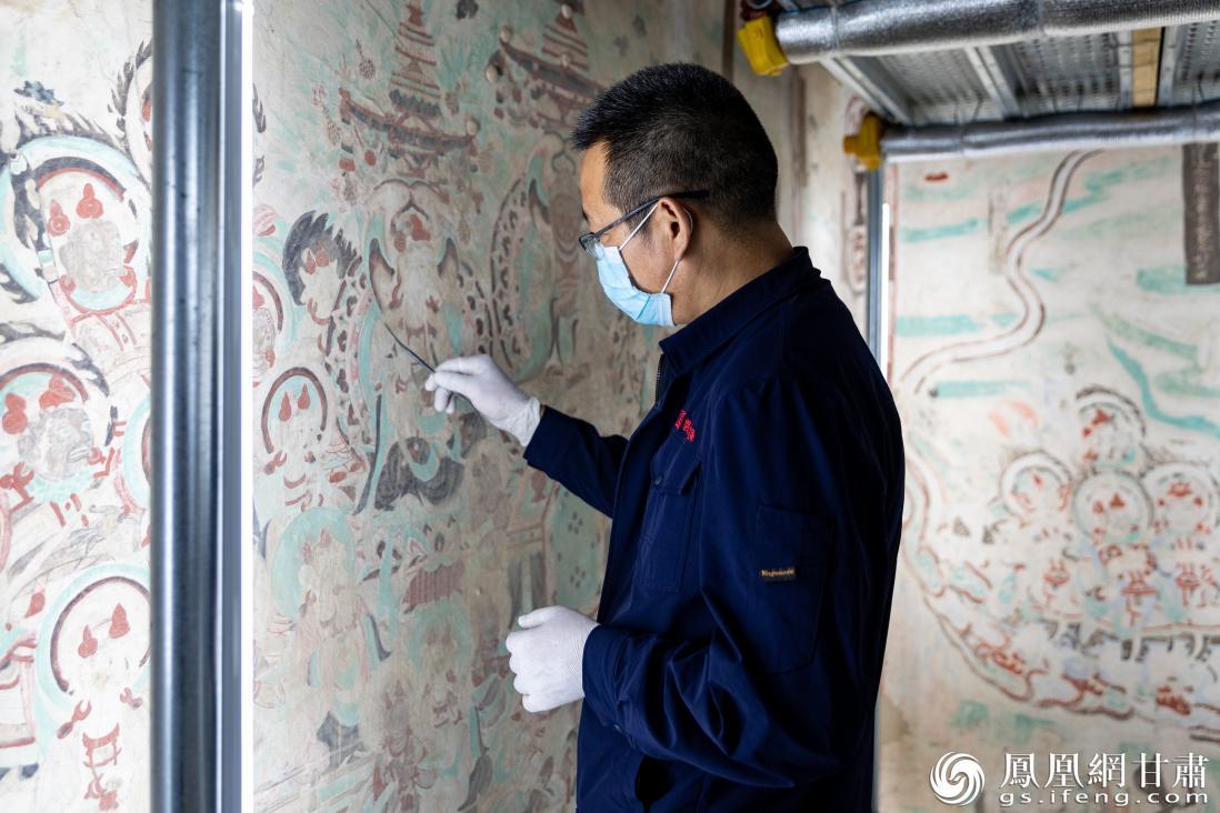 付有旭說(shuō),對(duì)敦煌壁畫(huà)有所破壞的鳥(niǎo)、鼠、蟲(chóng)害如今已基本得到防治,而其他病害,各個(gè)洞窟面臨的類(lèi)型和程度都不一樣,修復(fù)人員要找到最佳方案精準(zhǔn)施工。比如被稱(chēng)作壁畫(huà)“癌癥”的酥堿,其形成過(guò)程復(fù)雜,危害較大,最難治理,敦煌研究院的壁畫(huà)修復(fù)師們不斷研討方案,采用控制水分和濕度、用自制工具吸附鹽分等方法,因地制宜,才讓酥堿病害得到有效控制。