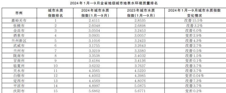 2024年1月—9月,全省14個地級城市及蘭州新區(qū)地表水環(huán)境質(zhì)量綜合排名由優(yōu)至劣分別為:嘉峪關(guān)市、張掖市、金昌市、酒泉市、蘭州新區(qū)、武威市、蘭州市、隴南市、甘南州、臨夏州、天水市、白銀市、定西市、平?jīng)鍪小c陽市。
