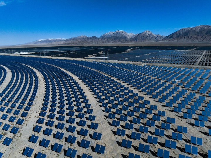 青海省海西蒙古族藏族自治州德令哈市光伏(光熱)產業園的光熱電站(2024年4月23日攝,無人機照片)。新華社記者 張龍 攝