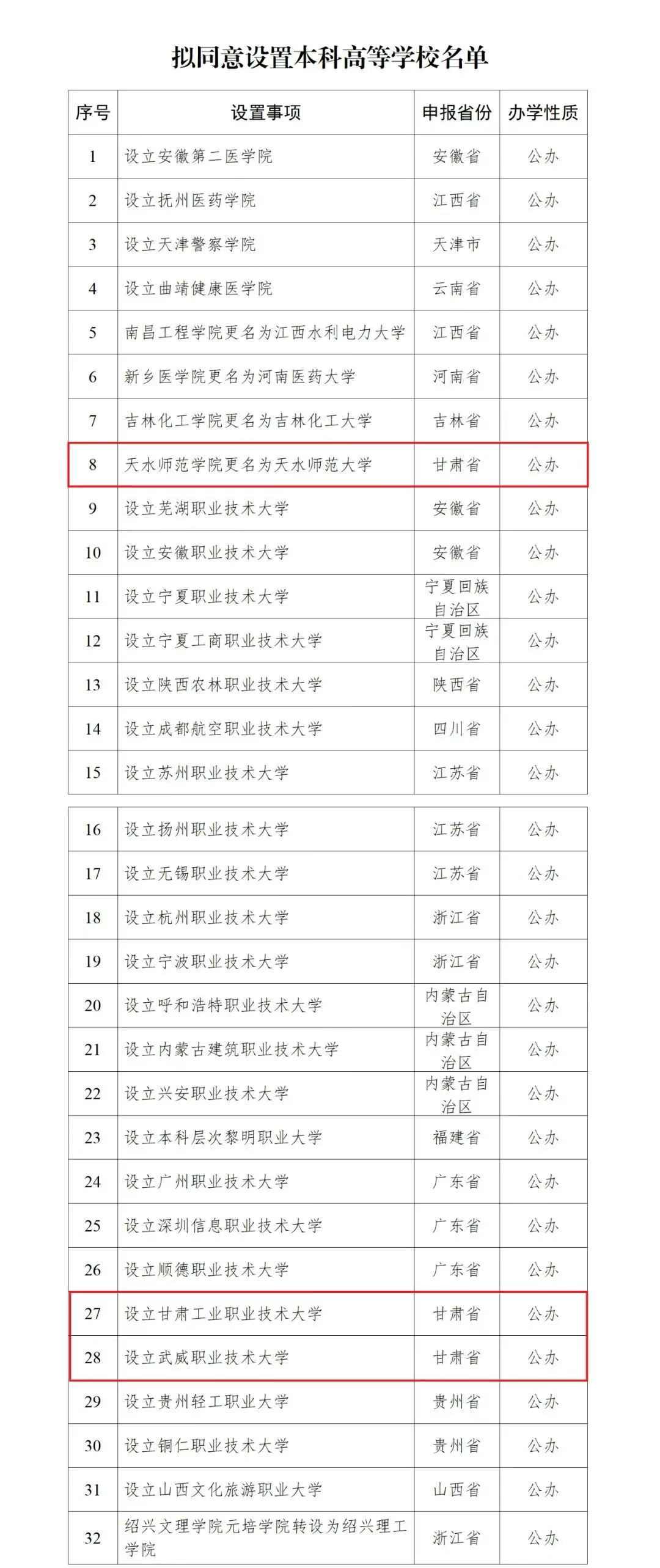 32所學校中,我省天水師范學院更名為天水師范大學,新設立甘肅工業職業技術大學與武威職業技術大學,三所大學均為公辦學校。