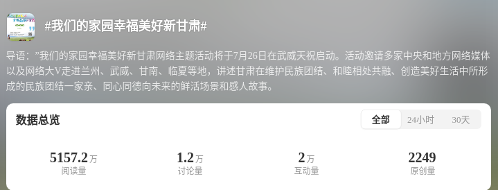 為深化互動引導,打造高流量IP,@甘肅網信、@快看甘肅等官方賬號發起社交平臺互動話題#我們的家園幸福美好新甘肅#。結合#厚道甘肅##萬千氣象看甘肅#等話題,@中新觀隴、@中國甘肅網、@甘肅好網民、@蘭州新區發布、@甘南融媒等賬號同步發力、同頻共振。目前,該話題總閱讀量超5530萬人次,討論互動量3.2萬人次。