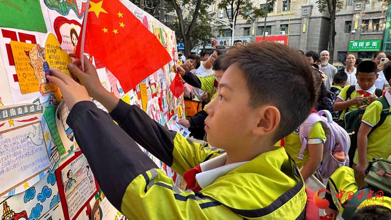 早上八點,孩子們手執鮮艷的國旗,踏著《歌唱祖國》《我們是共產主義接班人》的歌聲步入校園。在校門口設立的“我與先輩的時空對話”打卡墻成為情感表達的窗口,孩子們用真摯的語言寫下對先輩的崇敬與承諾:“我們會讓祖國更強大”“我們會像愛護紅領巾一樣愛護祖國”。一字一句,跨越時空,傳遞著少年對歷史的回應和對未來的擔當。