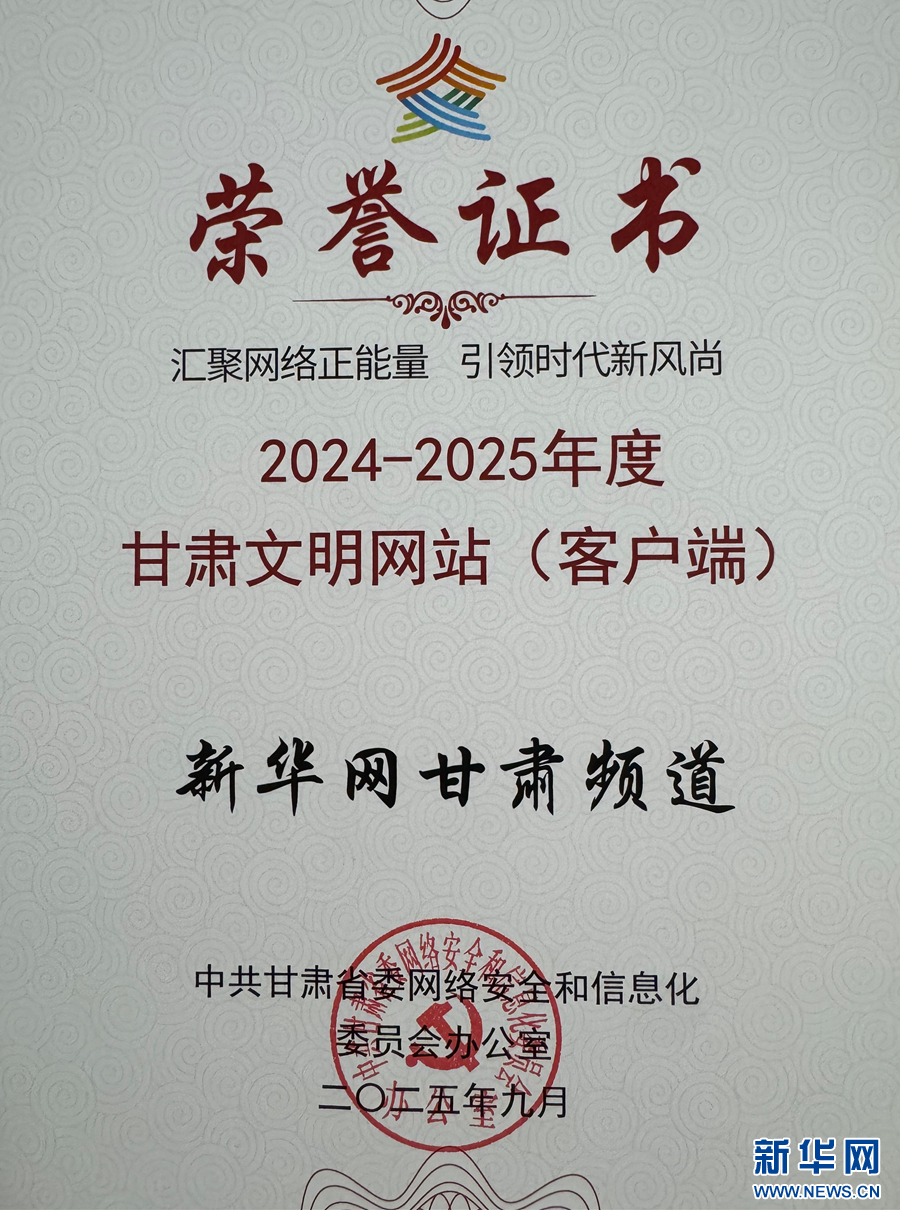 新華網(wǎng)甘肅頻道獲評“2024—2025年度甘肅文明網(wǎng)站(客戶端)”稱號。