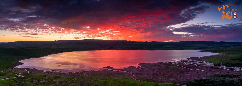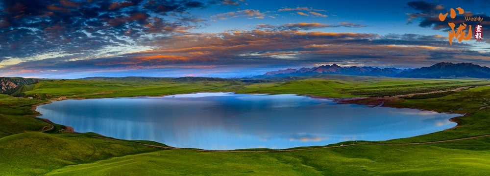 夕陽西下的時候,晚霞將西邊的天空映得通紅,云朵如火焰般燃燒。而此時,五彩的山巒與綠色的草原相互映襯,形成鮮明對比,十分壯觀和漂亮。
