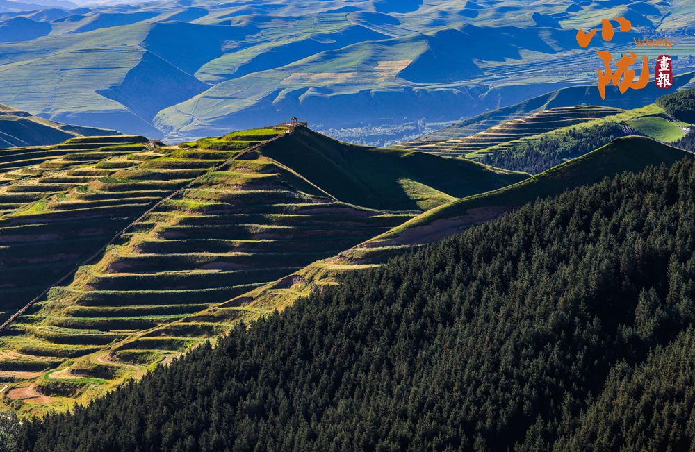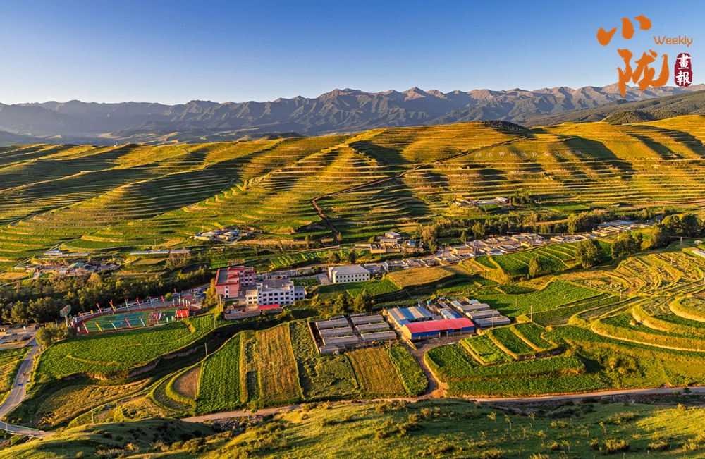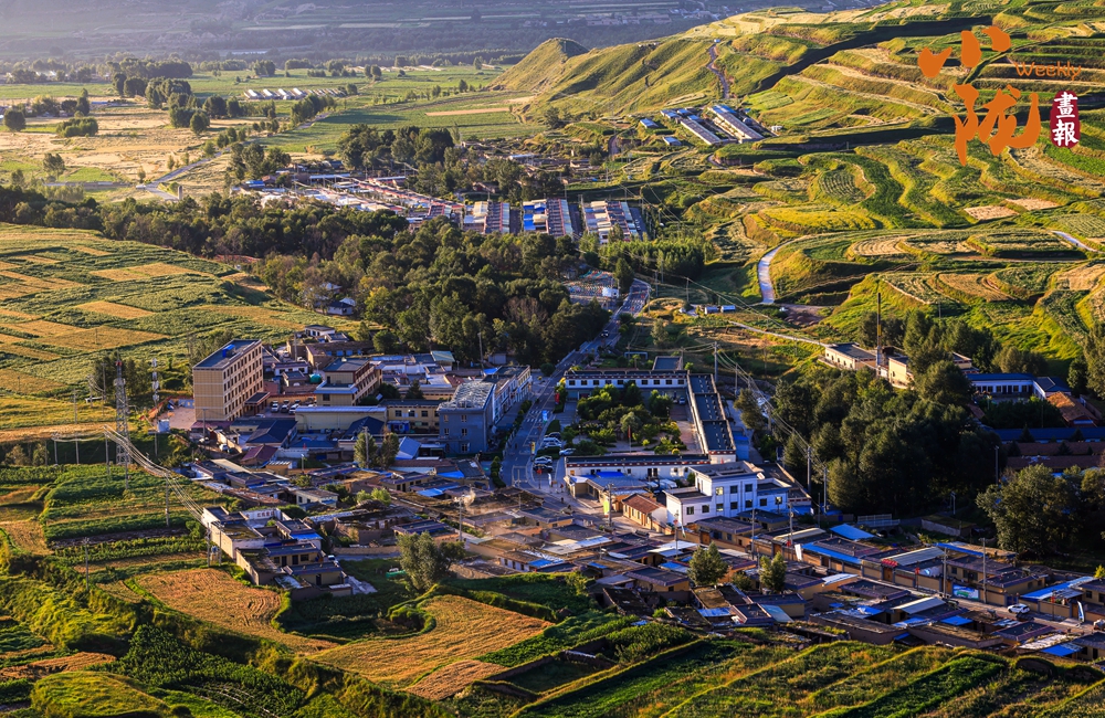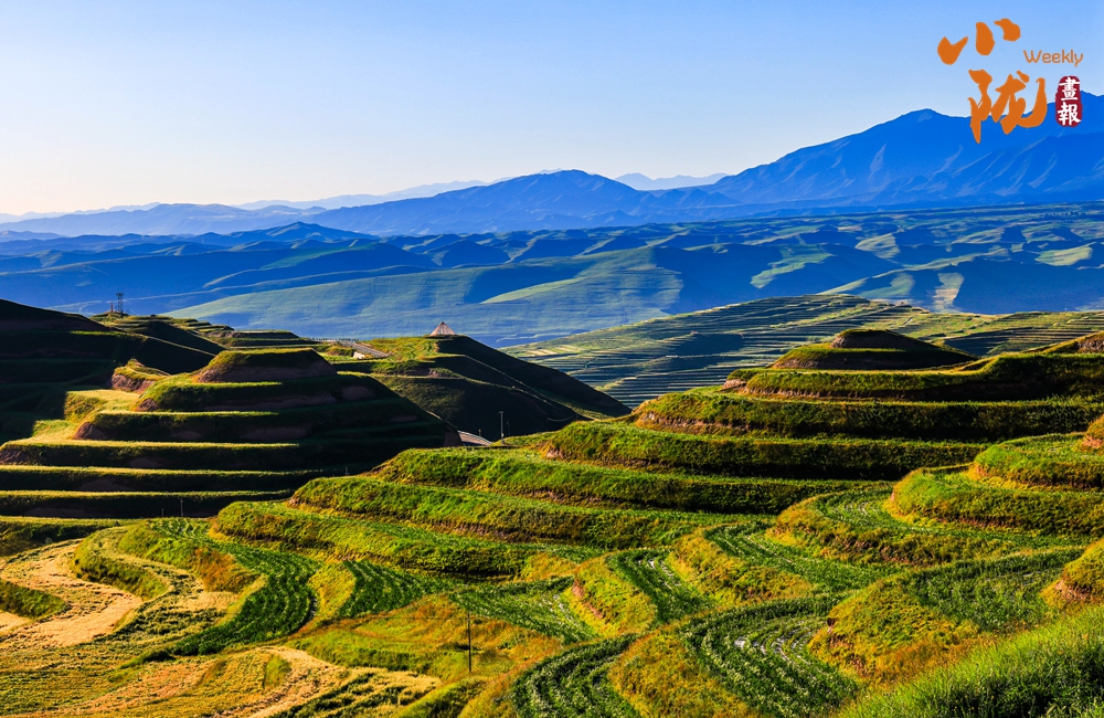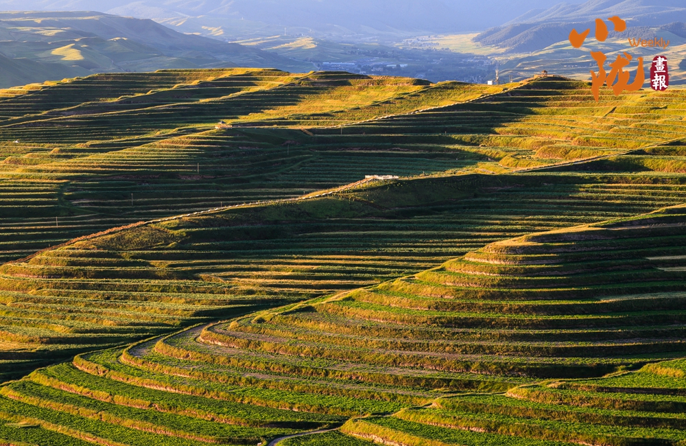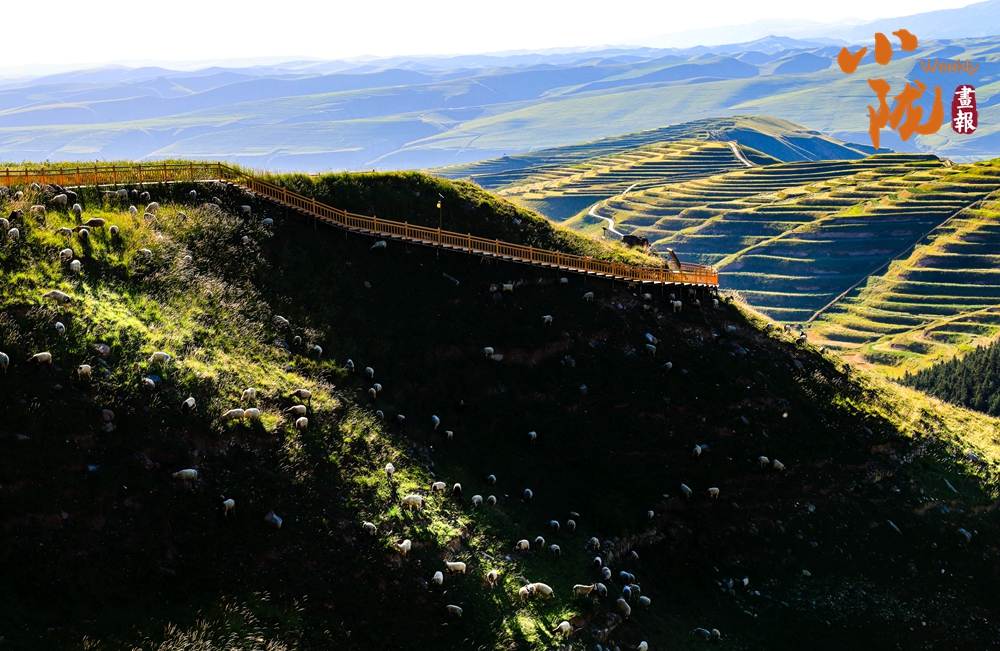 溝壑縱橫,滿目生綠。廣袤的田野在陽光下盡情綻放著大自然的絢麗多彩,熱烈地期盼著新季節(jié)的到來;羊群如散落的云朵,在坡地間緩緩移動(dòng),盡享這份寧靜與和諧。
