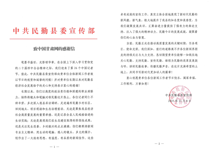 民勤縣委宣傳部在信中深情回顧了中國甘肅網與民勤縣多年來的深厚合作情誼。信中指出,長期以來,中國甘肅網始終以高度的政治責任感和深邃的職業洞察力,將鏡頭和筆觸聚焦民勤這片熱土。從生態文明建設到鄉村振興戰略,從項目建設“主戰場”到防沙治沙“第一線”,記者們不辭辛勞,深入民勤的鄉村社區、田間地頭,用腳步丈量民勤大地,用鏡頭記錄時代變遷。他們秉持新聞專業主義精神,以生動的筆觸、感人的鏡頭、多元的媒介形式,創作推出了一大批有思想、有溫度、有品質的新聞佳作,為民勤的發展注入了強大的精神動力。