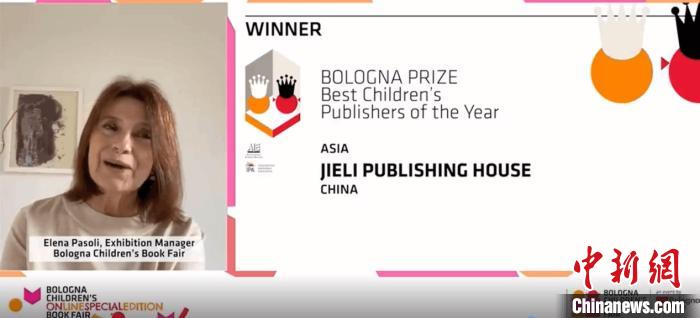 博洛尼亞童書展展覽總監艾蓮娜?帕索里宣布2020年度最佳童書出版社大獎。接力出版社供圖