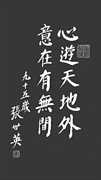 張先生的人生是圓滿的。趙樸初《遺囑》說:“生固欣然,死亦無憾。花落還開,水流不斷。我兮何有,誰歟安息?明月清風(fēng),不勞尋覓。”弘一法師《辭世二偈》之二說:“華枝春滿,天心月圓。”這些遺言,都顯示了一種人生圓滿的喜悅。張先生書法集中的兩句話:“心游天地外,意在有無間。”同樣顯示了一種人生圓滿的喜悅。