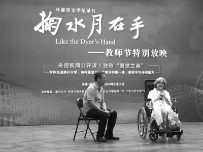 九月十日教師節,南開大學舉辦《掬水月在手》影片首映式。葉嘉瑩先生是國際儒聯榮譽顧問,我銜命陪同王念寧副會長專程赴南開致賀,有幸在南開禮堂聆聽九十六歲高齡的迦陵先生與白巖松共話詩意人生。迦陵先生坐在輪椅上娓娓道來,鬢發皤然,聲如洪鐘,風華絕代。
