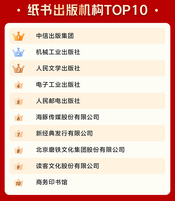此外,通過紙書出版機構TOP10、電子書出版機構TOP10可以看出,品牌出版機構依靠過硬的產品以及品牌價值,持續獲得讀者認可,90%上榜的出版機構與2019年保持一致。