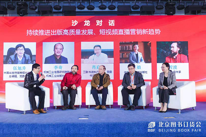 沙龍對話環節中,生活·讀書·新知三聯書店總編輯肖啟明,機械工業信息研究院院長、機械工業出版社社長李奇,華東師范大學出版社董事長、社長王焰,國家一級作家雪漠,共同探討短視頻直播營銷心得、經驗及趨勢。