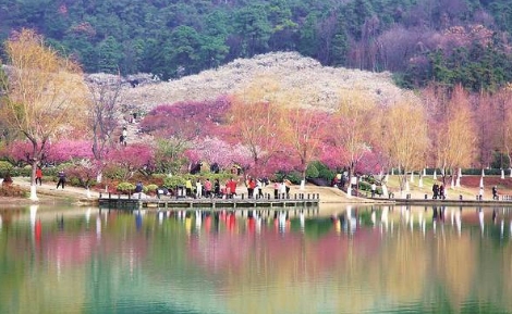 進入景區,走過一座石拱橋,眼前,一汪清水,綠意萌發,乃傳說的“鹿女湖”。不時用手撩撥著拂面的楊柳,沿湖畔小徑繞行數百米,往上攀登,穿過一個山口,整個梅嶺景區,便不驚不乍,呈現在眼前。霎時,我們被如此壯觀的山水梅林驚呆了。清凌凌的湖水邊、亭臺水榭間,依山而栽種的梅樹,紅的、白的、粉的、綠的梅花,競相綻放,層層疊疊、婆娑飛舞,爭芳斗艷、姹紫嫣紅,儼然一幅3D山水畫,仿佛置身“香國仙境”。