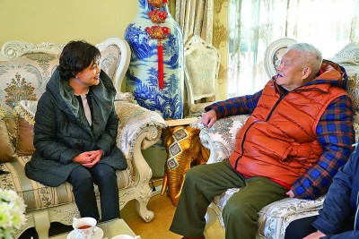 2017年,中國作協主席鐵凝(左)看望彭荊風。資料圖片