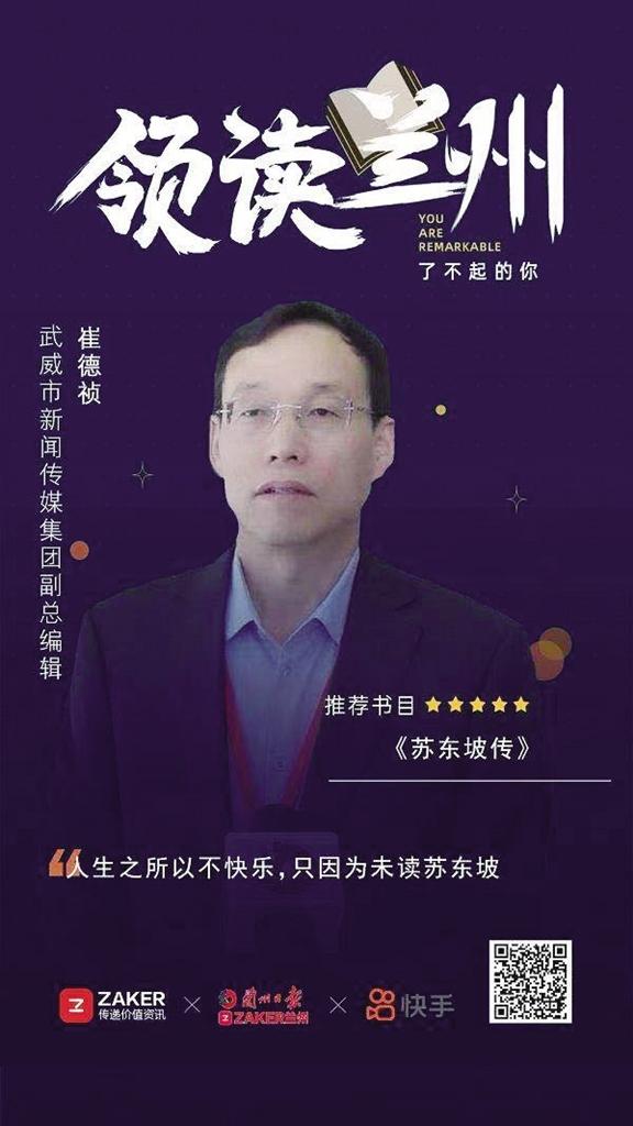 “領讀蘭州·了不起的你”大使薦讀進行時……今天的薦讀大使是武威市新聞傳媒集團副總編輯崔德禎,他最近正在讀的書是林語堂先生的《蘇東坡傳》,他向大家推薦這本書,希望跟大家一起閱讀!