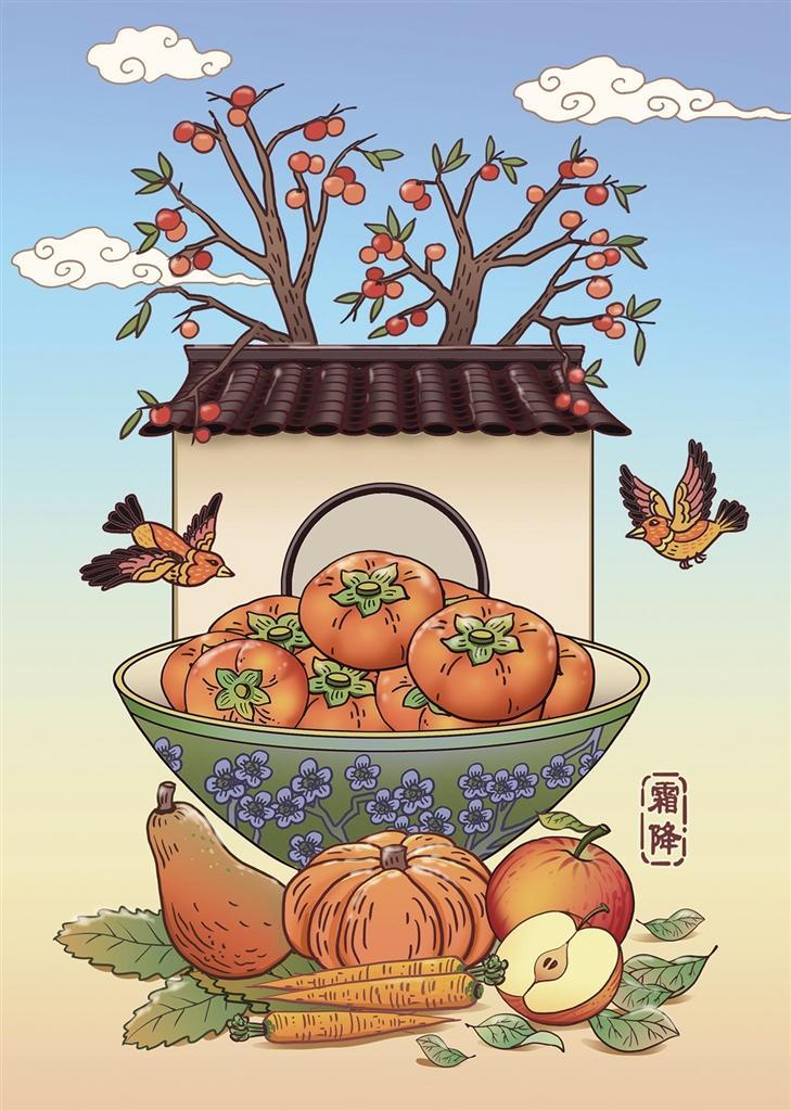 “每年10月23日前后為霜降,這是隸屬秋季的最后一個節氣。”據中國氣象局氣象服務首席專家、中央電視臺《天氣預報》節目主持人宋英杰介紹:“秋時已,亦稱秋(miao,樹梢)秋,即將畫上句號。秋日素秋,風日謝風,辰日霜辰,草日衰草,木日疏木。‘氣肅而霜降,陰始凝也’,水汽凝華為白色冰晶。”