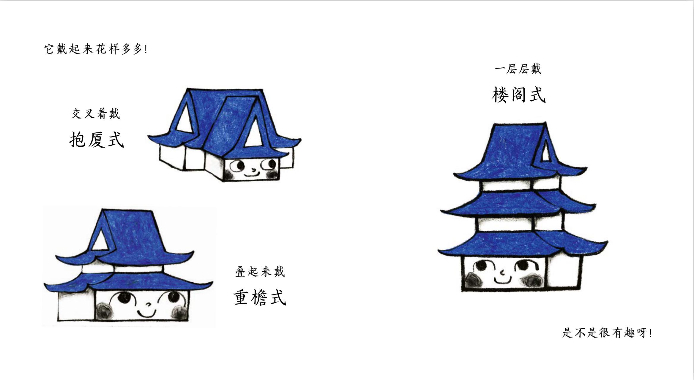 作者以真實的傳統建筑為原型,選取屋頂、鴟吻、窗欞、斗拱、瓦當和柱礎這六個頗有代表性的傳統建筑構件,讓他們自由地演繹自己的故事。比如,介紹屋頂時,想象成“給房子戴帽子”,不同的“帽子”有不同的名字,還有不同的戴法: