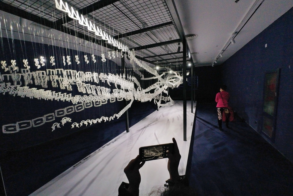 2022年1月3日,天津國圖·津灣文創空間舉辦,甲骨文創意展,一名參觀者用手機拍攝甲骨文懸空雕塑。 中新社記者 佟郁 攝