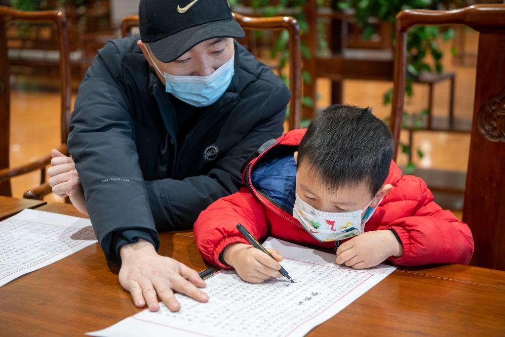 2月6日,小朋友和家長在太原市圖書館參加“觀四庫 抄經典”活動。
