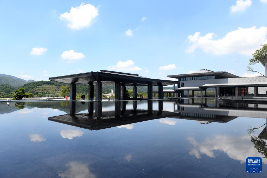杭州國家版本館屋頂的木構和青瓷門扇相映成趣(7月23日攝)。
