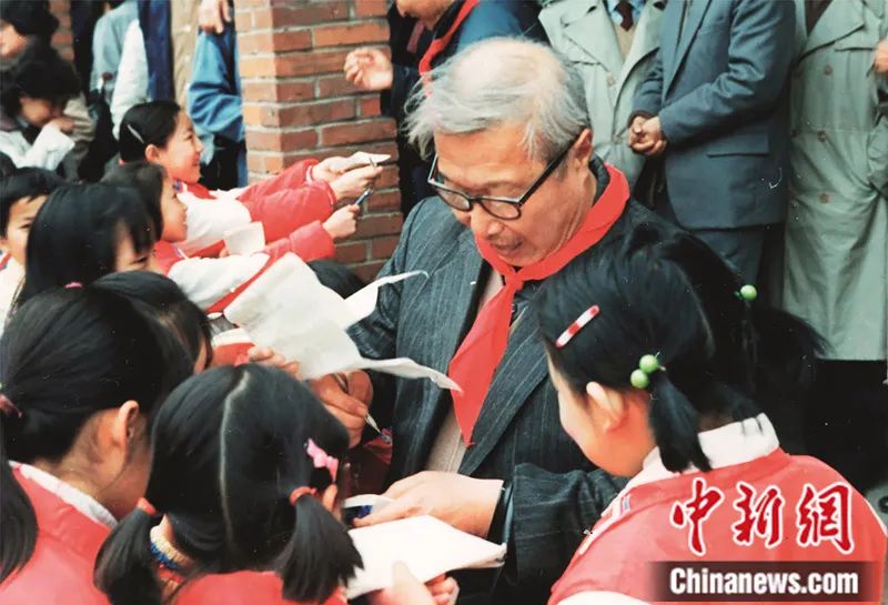 任溶溶為學生簽名。中新社發 受訪者 供圖