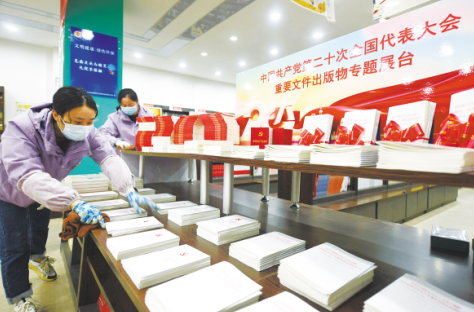 連日來,江蘇省連云港市東海縣新華書店精心設(shè)置了黨的二十大重要文件出版物專題展臺,集中展示展銷黨的二十大文件及學(xué)習(xí)輔導(dǎo)讀物,同時(shí)增設(shè)閱讀區(qū),市民可以隨時(shí)閱讀黨的二十大報(bào)告單行本、《黨的二十大報(bào)告輔導(dǎo)讀本》、《中國共產(chǎn)黨章程》單行本等圖書,吸引了眾多黨員、學(xué)生、市民和機(jī)關(guān)企事業(yè)單位人員等不同群體的讀者前來閱讀選購。