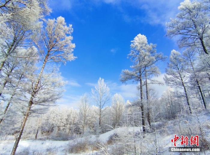 資料圖:根河市出現的大范圍霧凇將群山裝扮成了銀裝素裹的童話世界。 劉麗平 攝