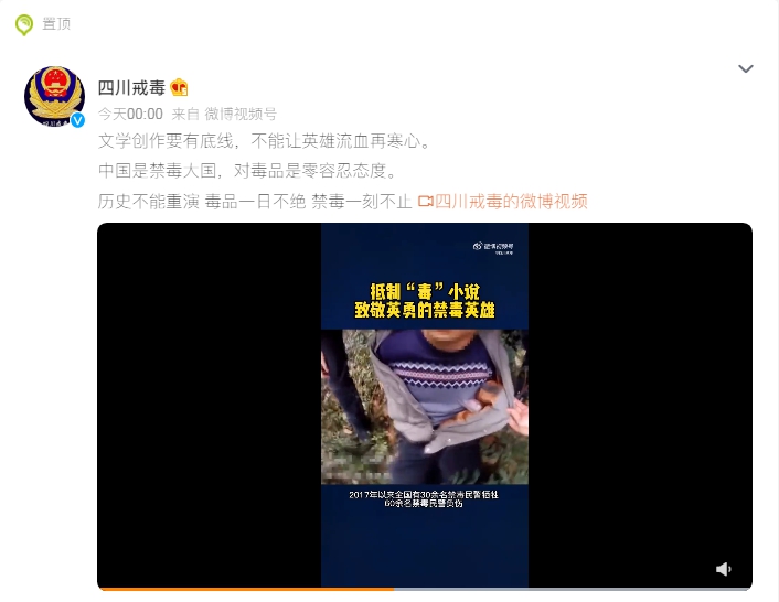 四川省戒毒管理局在此次發聲中表示,中國是禁毒大國,是世界上列管毒品最多、管制最嚴的國家,對毒品是零容忍態度。面對暴戾的毒販,緝毒警察每一次抓捕都以命相搏。聲明強調,抵制“毒”小說,致敬英勇的禁毒英雄。