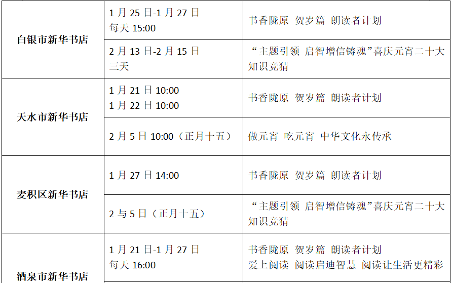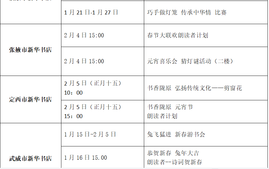 寅虎辭舊,卯兔迎新,從除夕到十五,甘肅省新華書各市州門店為廣大市民精心籌備了“炫春倡閱讀 書香永傳承”為主題的“看”“聽”“玩”“學(xué)”“吃”迎新春系列活動。