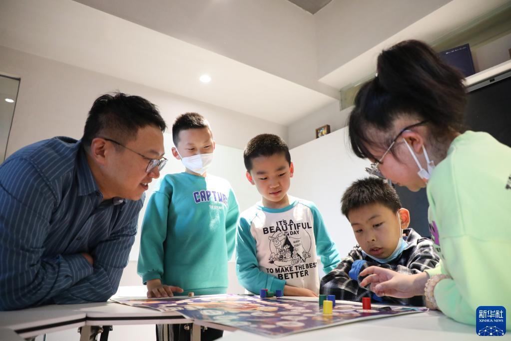 4月1日,在甘肅省蘭州市的讀者出版集團數字閱讀中心讀者小站,工作人員與小朋友一起玩“講述中國神話故事”的飛行棋游戲。新華社記者 馬希平 攝