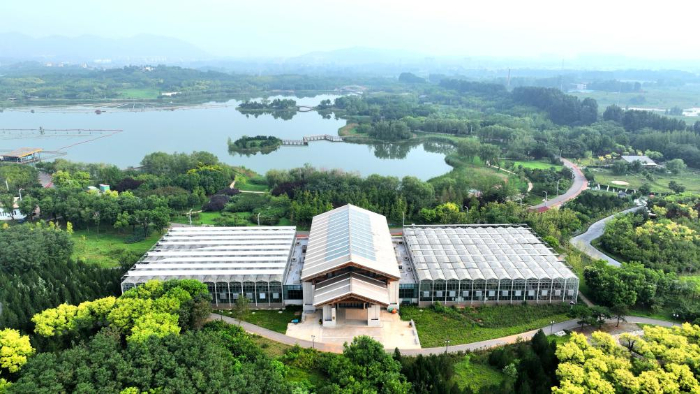 8月9日拍攝的位于河北省石家莊市鹿泉區龍泉湖公園內的一處公園書房(無人機照片)。